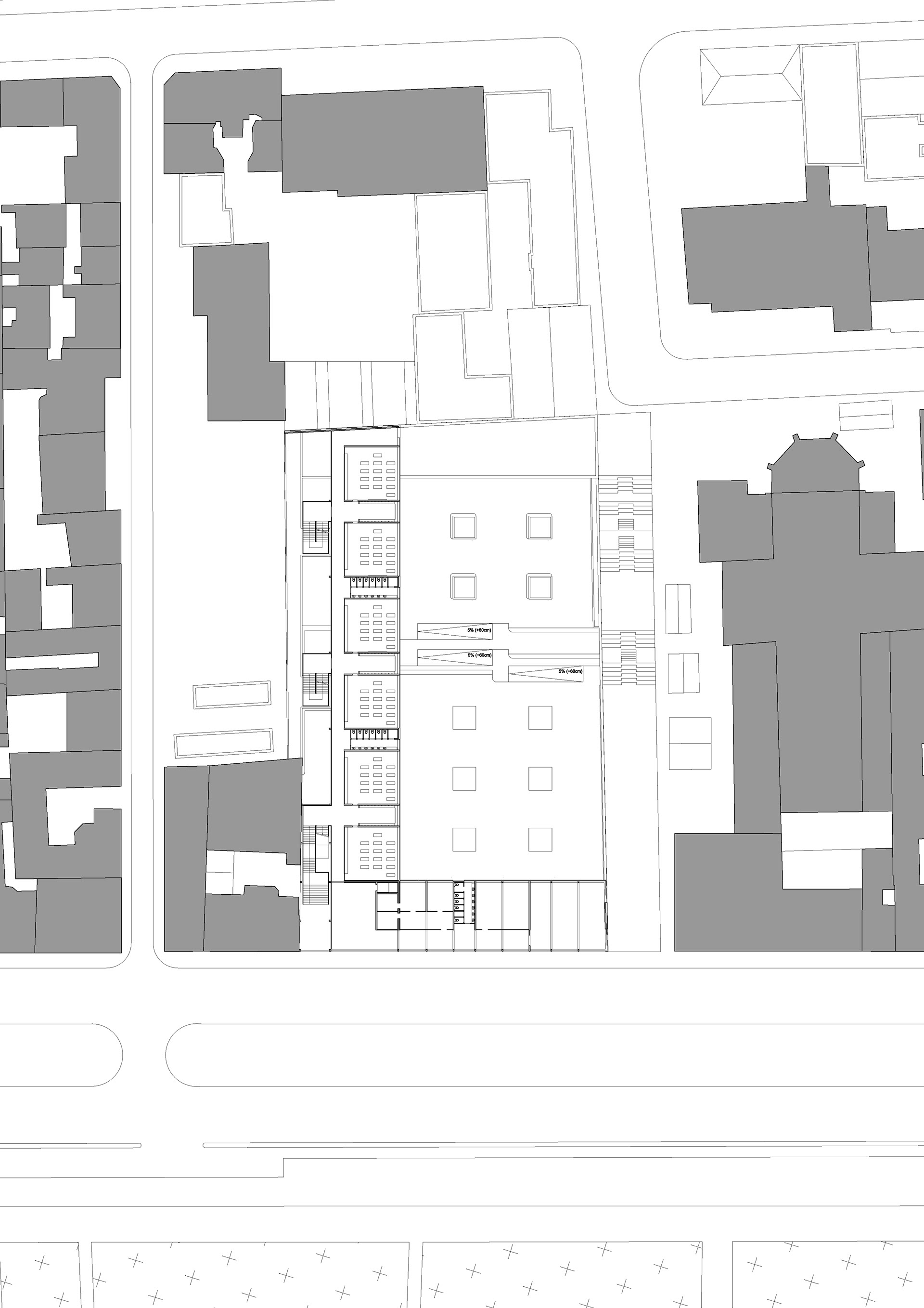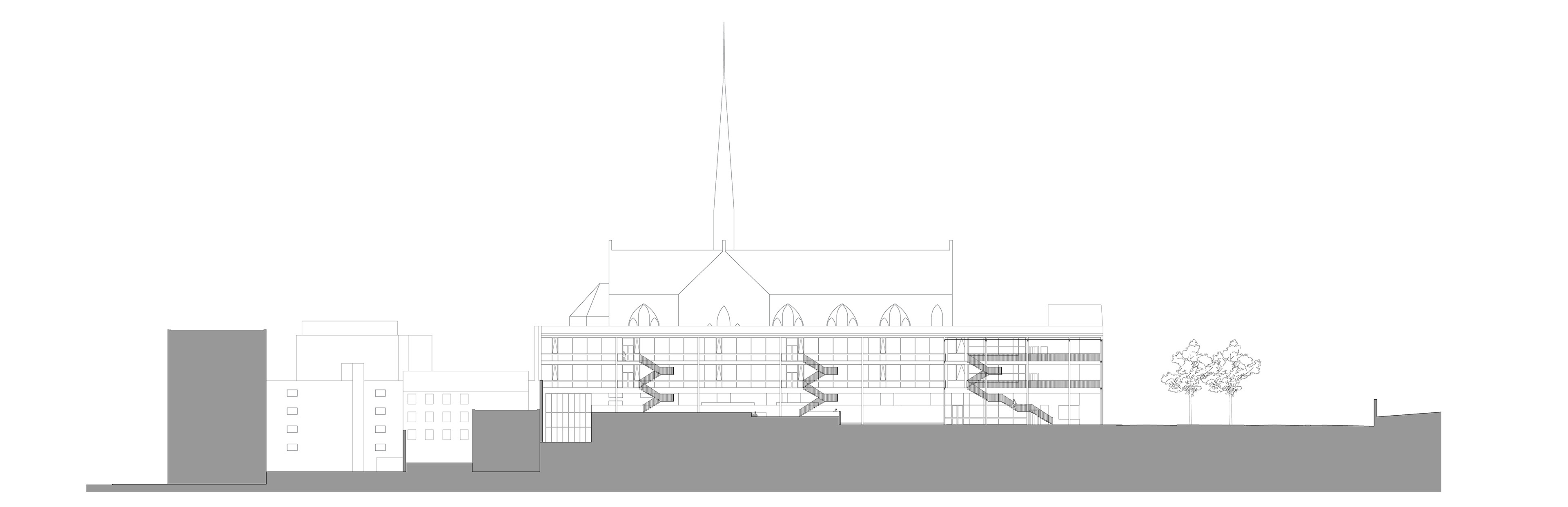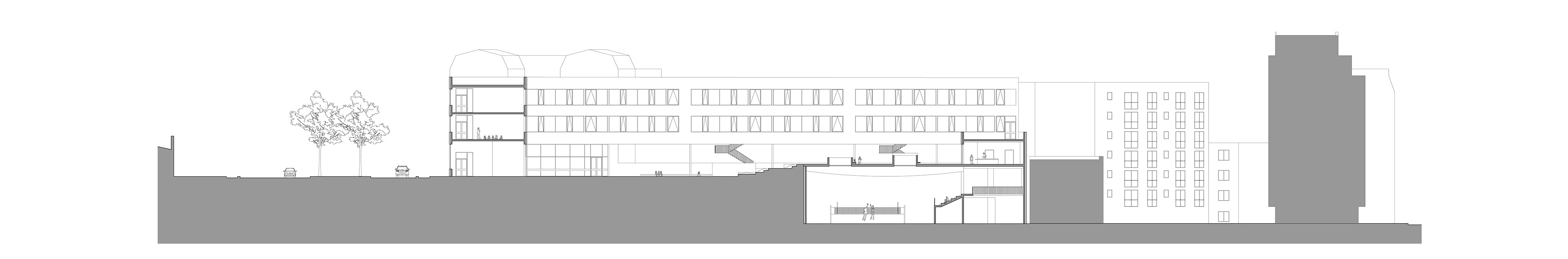 This project consists of the design of two public facilities, a primary school and a gymnasium. While the latter is intended for a multigenerational audience, a primary school must be designed for children who attend it every day. The topography of the site allows for a leveled design. A new alley is built between the boulevard and Rue René Villermé, 7 meters lower to the west. The school is accessible from Boulevard Ménilmontant through an atrium between the adjoining building and the school's street building, which extends into the depth of the site. The twelve classrooms are distributed in a wing crossing the plot from East to West, developing over two levels on stilts forming a playground in the courtyard. This courtyard rises at the back of the plot to become the roof of the semi-buried gymnasium, accessible from Rue René Villermé, 7 meters lower.